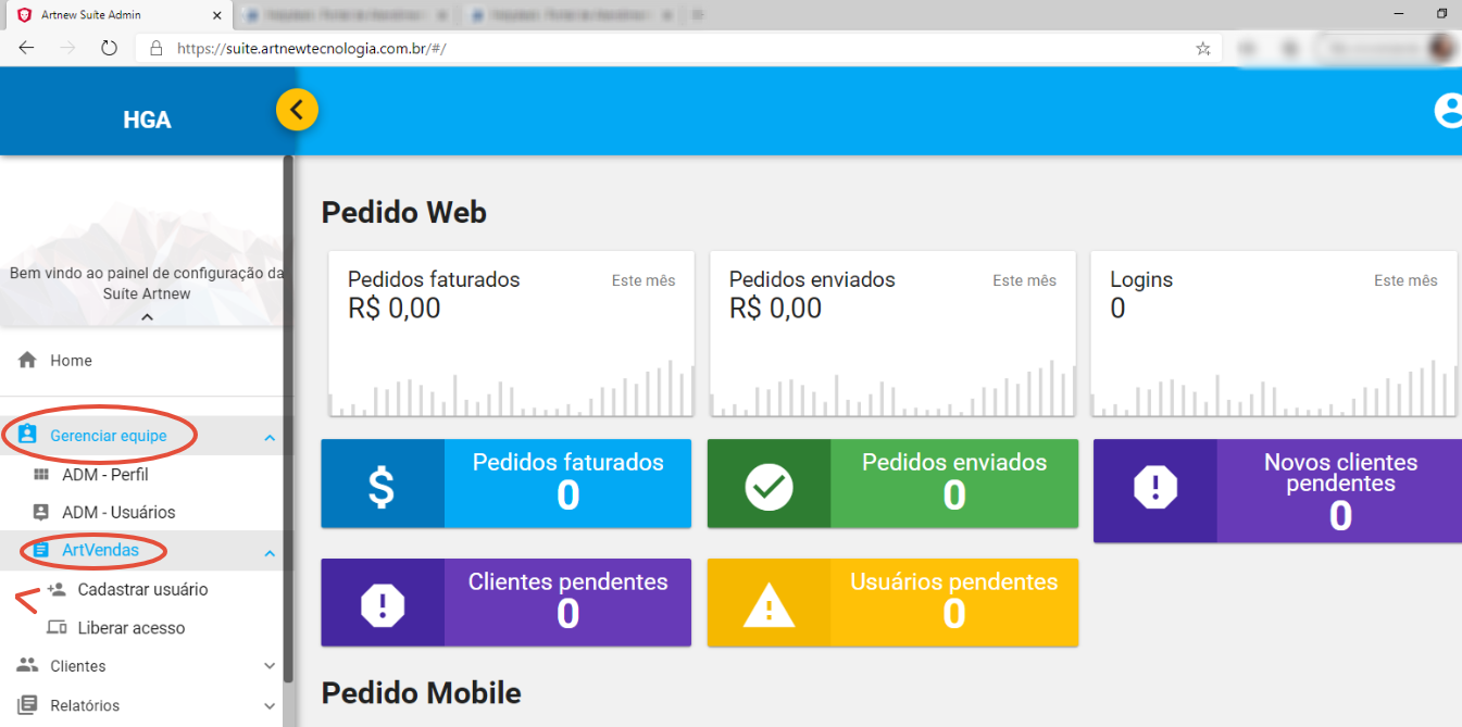 2.2 - Na opção [Gerenciar equipe > ArtVendas ] é realizado o cadastro / Liberação do usuário no Artvendas.