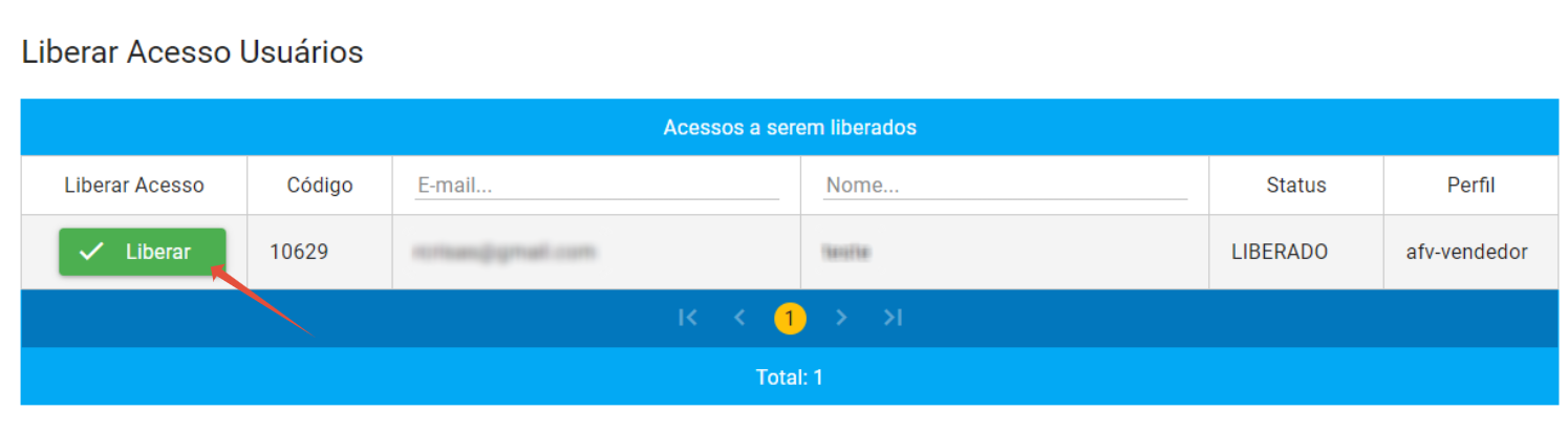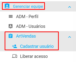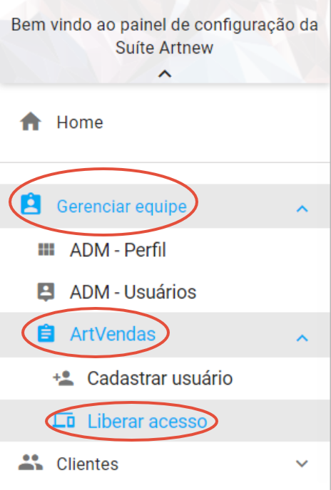 4.2 - No Menu (lateral esquerdo), selecione Gerenciar equipe > ArtVendas > Liberar Acesso