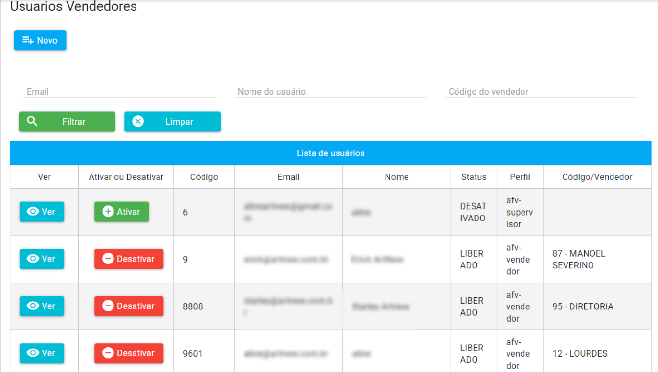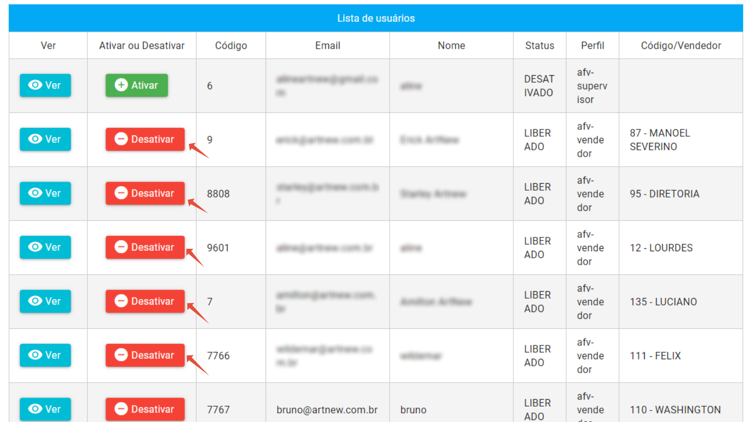 6.2 - Na listagem com todos os usuários, identifique o usuário e clique em Desativar.
