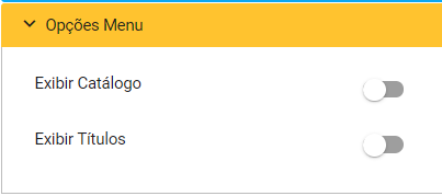 - > Opções Menu: Flags para habilitar a apresentação na barra de menu (Pagina-Web) dos componentes Catalogo (Inserido no sub-menu Catalogos) e Títulos (historico de compras do cliente)